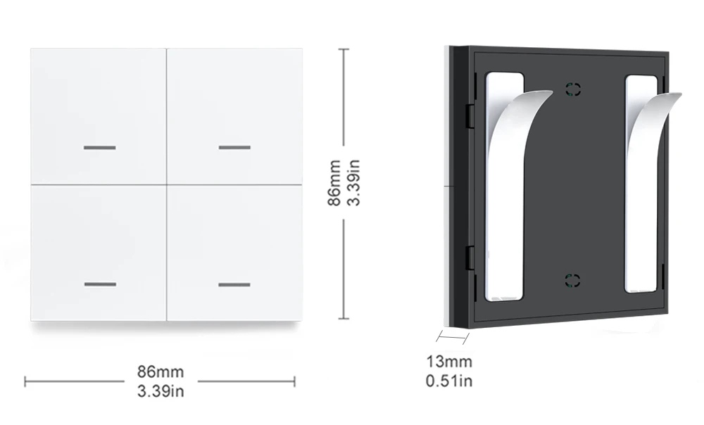 Power:CR2432 3Vx2 (not included)Operating temperaturehumidity:-10℃-55℃&<95% RHProduct size:86*86*13mmBattery LIfe:50000 timesCommumunication:Zigbee 3.0/BLE MESH(Optional)